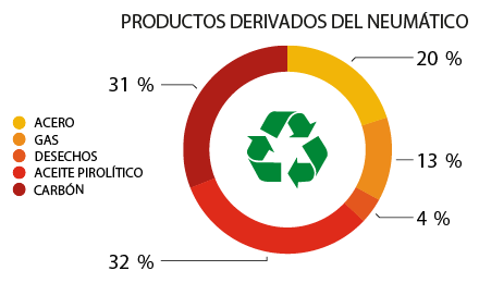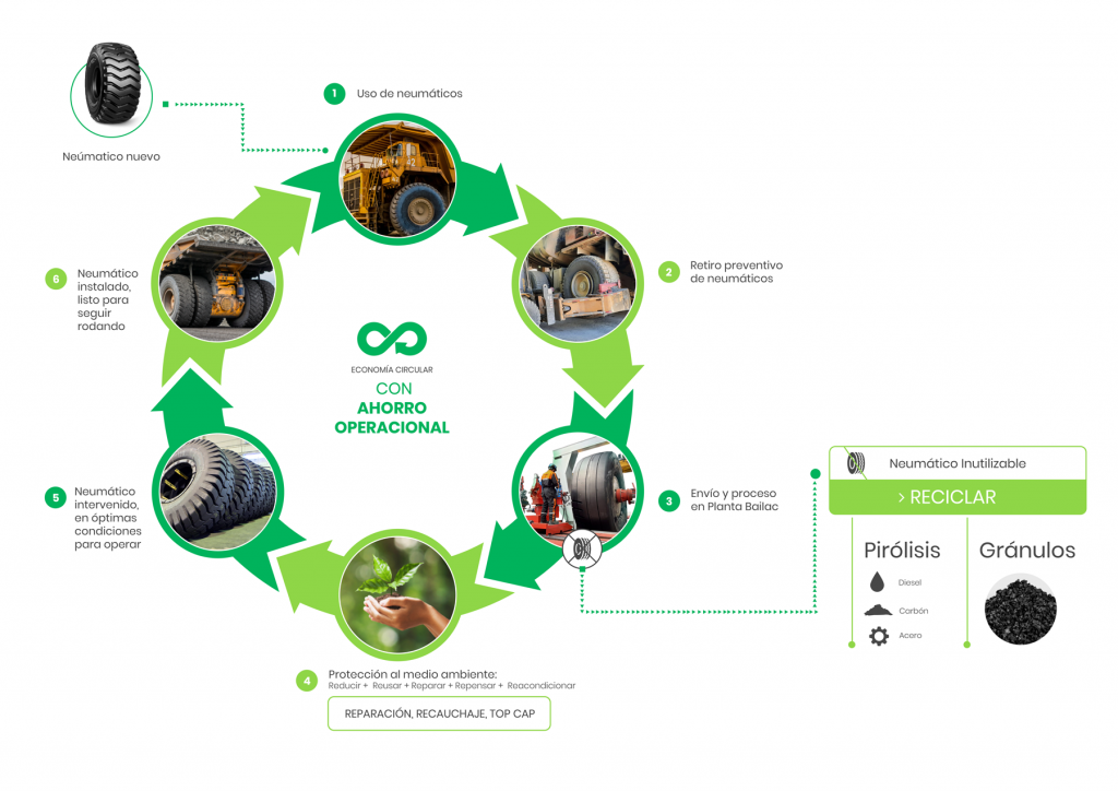 El servicio de reciclaje de neumáticos fuera de uso (NMFU) para la industria minera consiste en la disposición final del residuo mediante sistema pirolítico (descomposición del residuo a su origen).  Este proceso cumple con la ley REP (Ley de responsabilidad extendida) al reciclar y/o valorizar.
